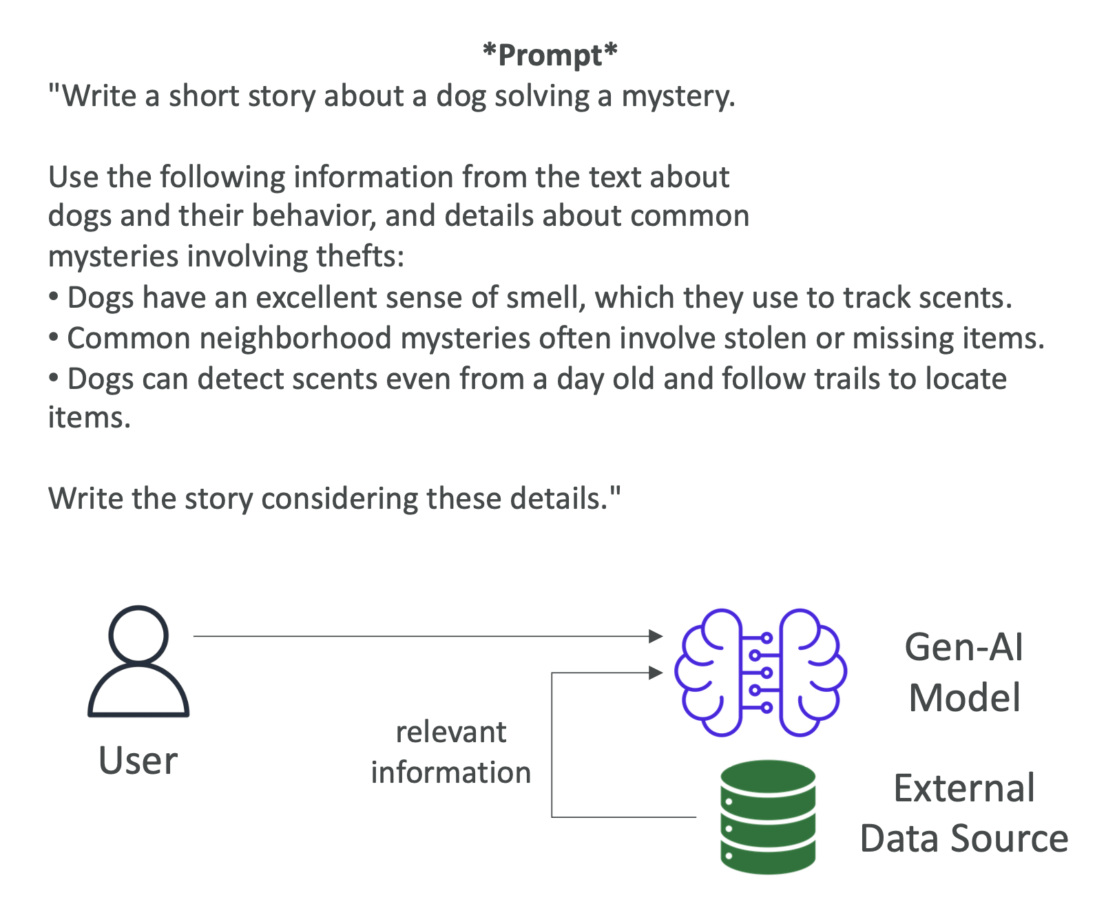 정의: 모델 자체 지식만 활용하는 것이 아니라, **외부 데이터(지식 베이스, 문서 등)**를 불러와 프롬프트에 추가해 더 정확하고 최신 정보를 포함하는 답변을 생성하는 기법.