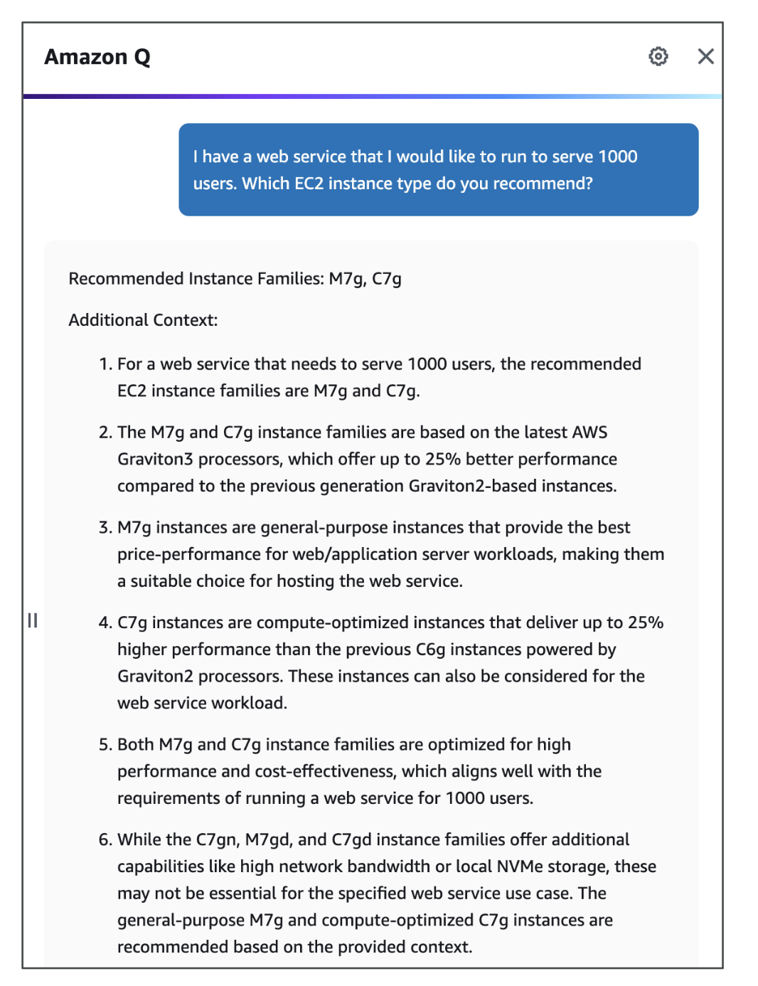 Amazon Q는 특정 워크로드에 맞는 EC2 인스턴스 유형을 추천합니다.