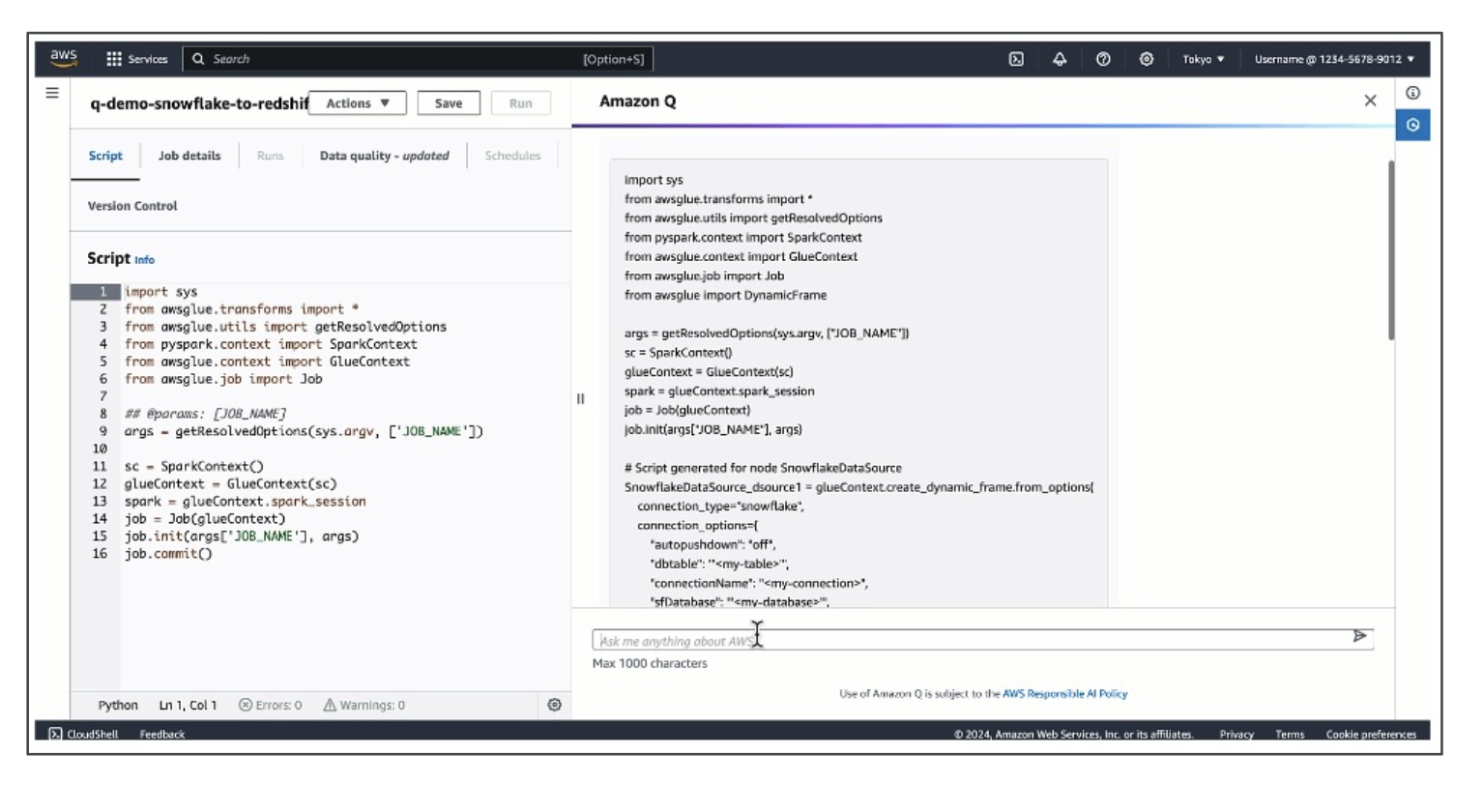 • 코드 생성: Glue ETL 스크립트 생성 및 코드 관련 질문 지원
