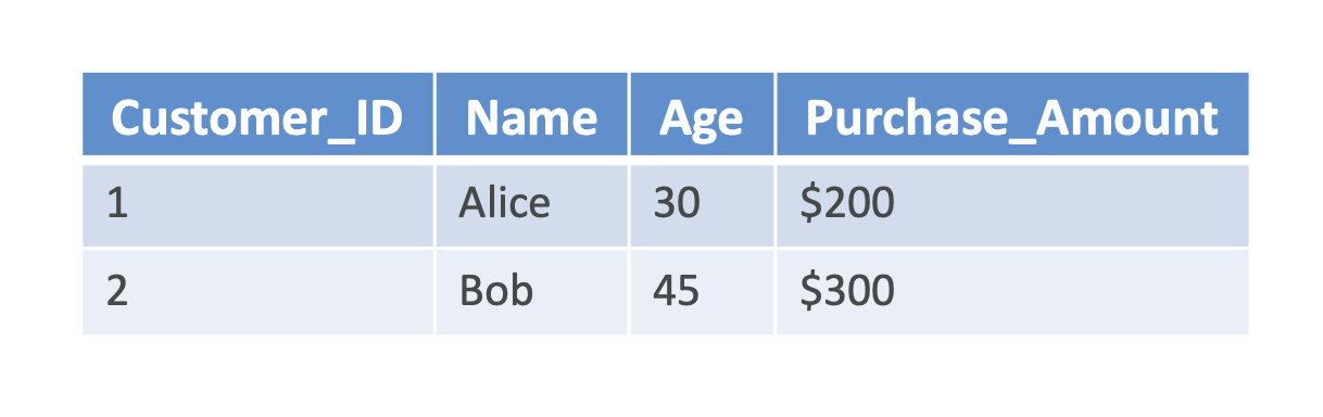 • 표 형태(Tabular): 고객 ID, 이름, 나이, 구매 금액