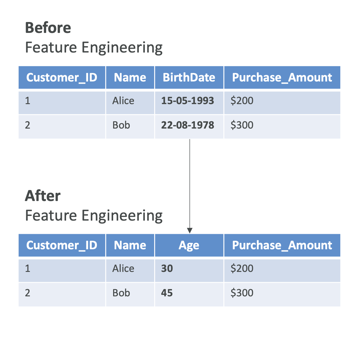 • 예: 생년월일 → 나이(age) 계산