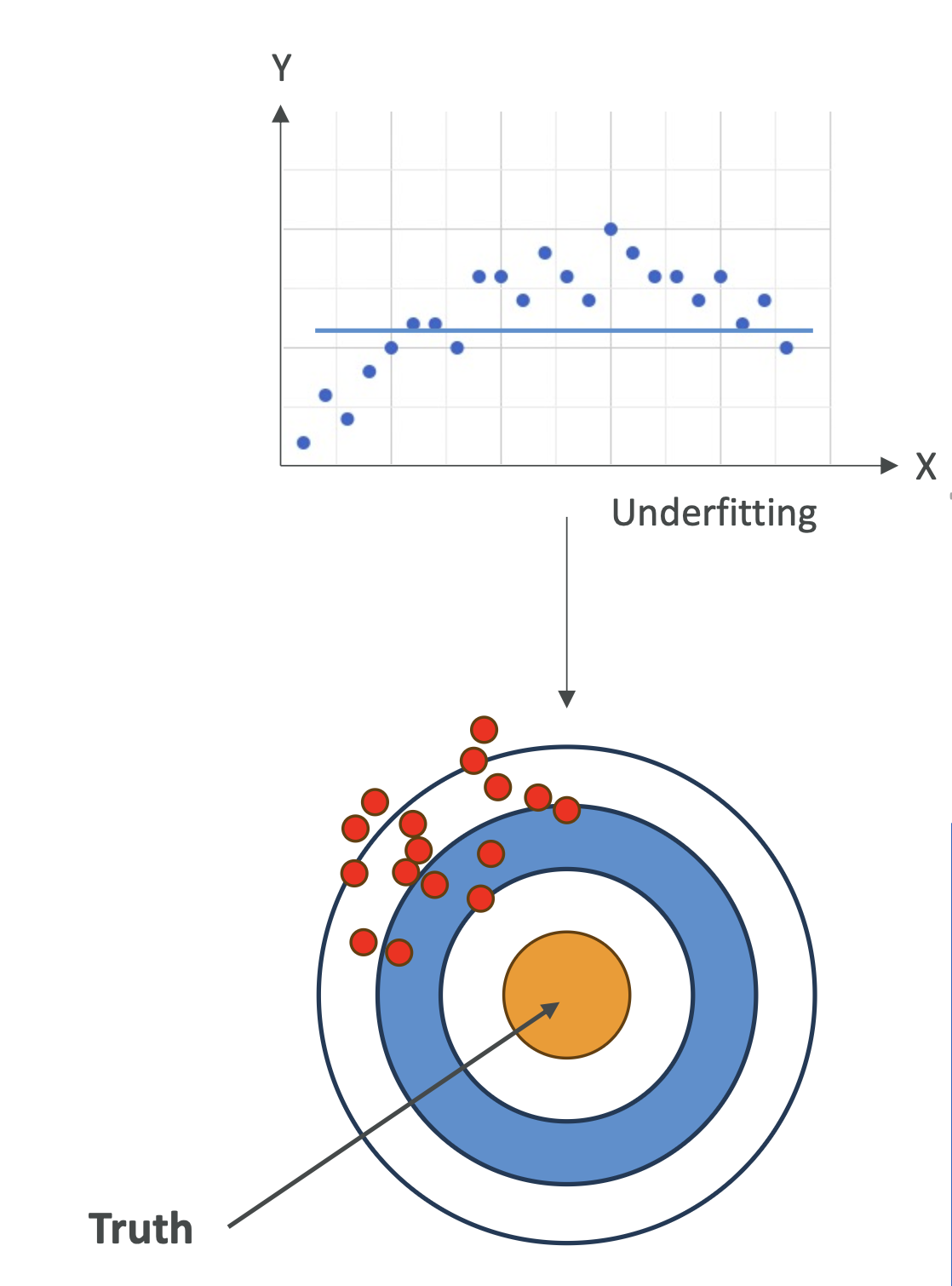 • 편향은 실제 문제(복잡할 수 있음)를 더 단순한 모델로 근사할 때 발생하는 오류입니다. 편향이 높으면 모델이 특성과 목표 출력 간의 관련 관계를 놓치게 되어 과소적합(underfitting)이 발생할 수 있습니다.