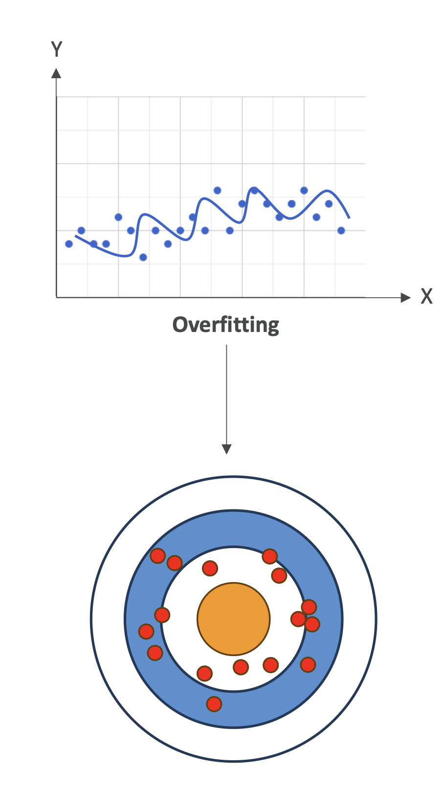 • 분산은 모델이 학습 데이터의 작은 변동에 민감하게 반응하여 발생하는 오류입니다. 분산이 높으면 모델이 의도한 출력 대신 학습 데이터의 무작위 잡음을 모방할 수 있습니다(과적합).