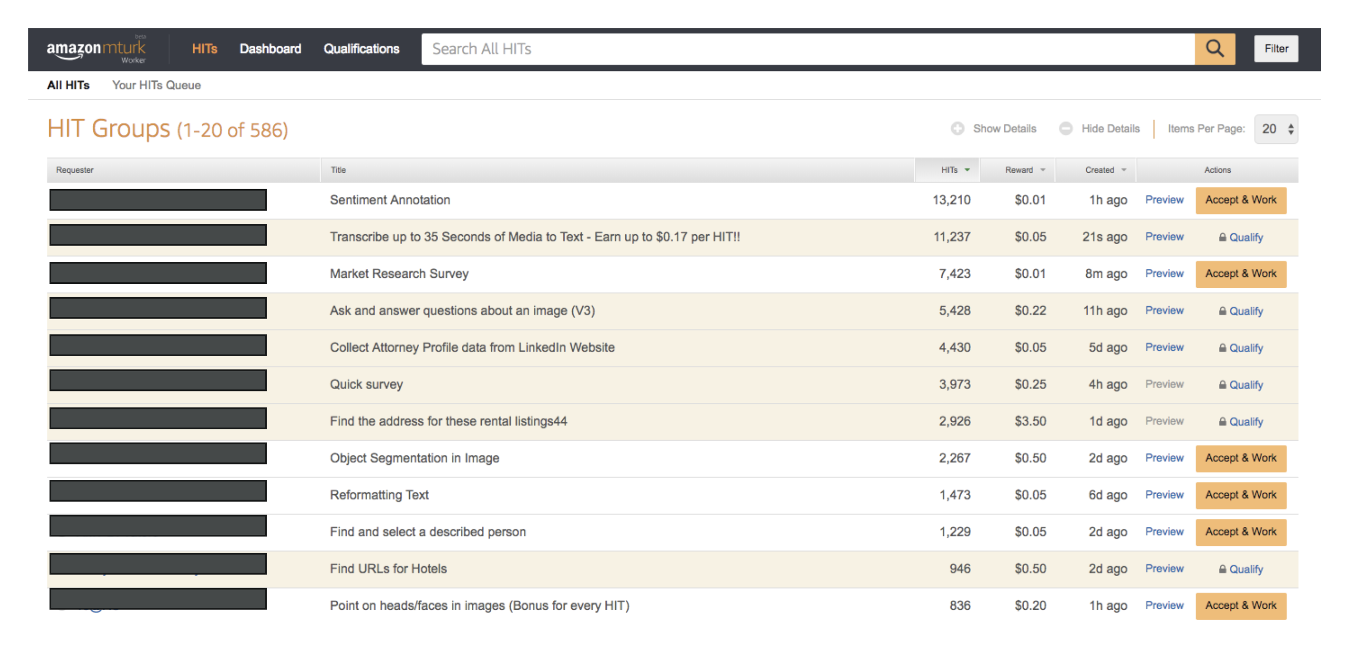 - 전 세계에 분산된 가상 인력을 통해 간단한 작업(HIT, Human Intelligence Task)을 저렴하게 처리할 수 있습니다.