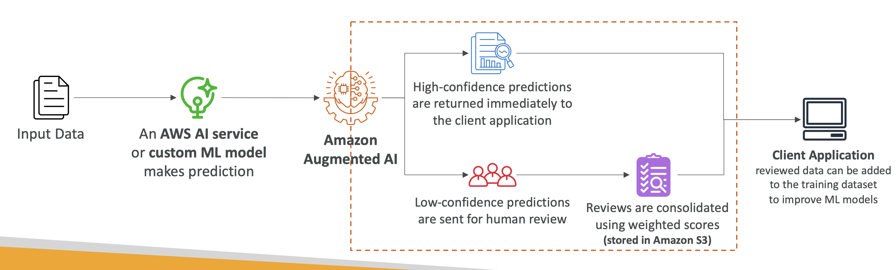 - Amazon A2I는 **머신러닝 예측 결과에 대한 인간 검토(Human-in-the-loop)**를 제공하는 서비스입니다.