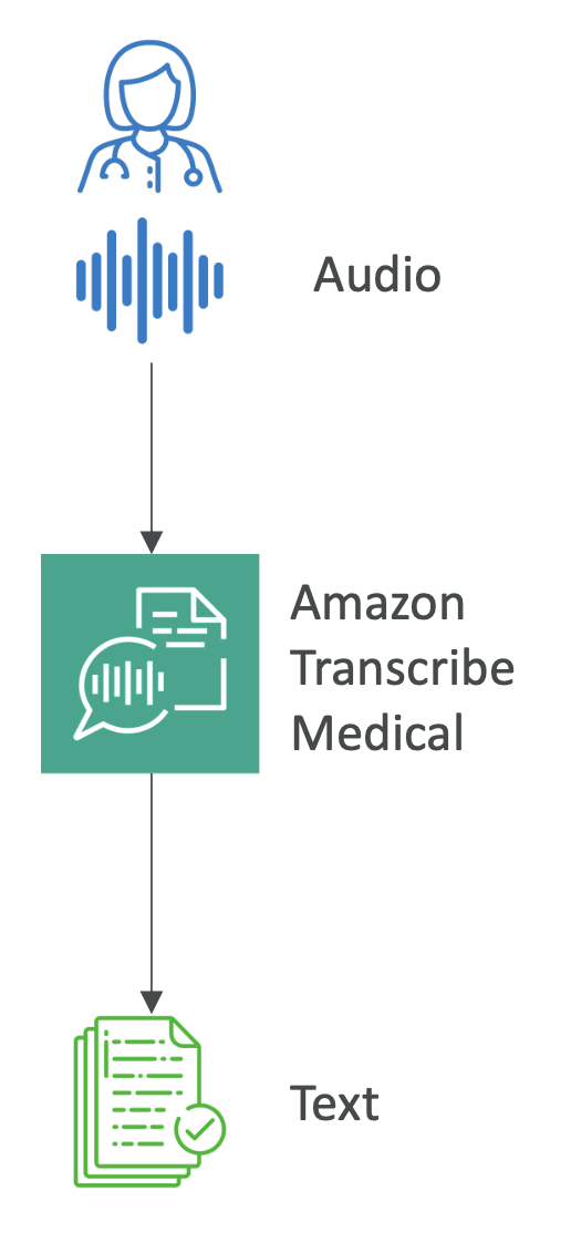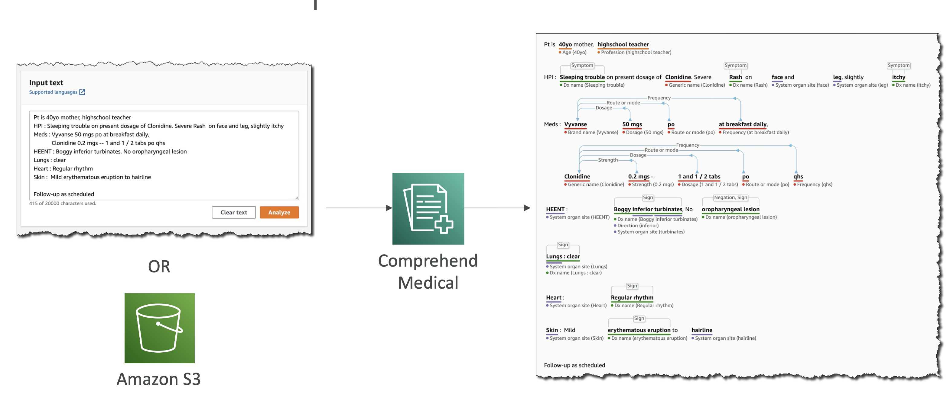 - 전사 입력: Transcribe Medical과 결합 → 음성 → 텍스트 → Comprehend Medical 분석